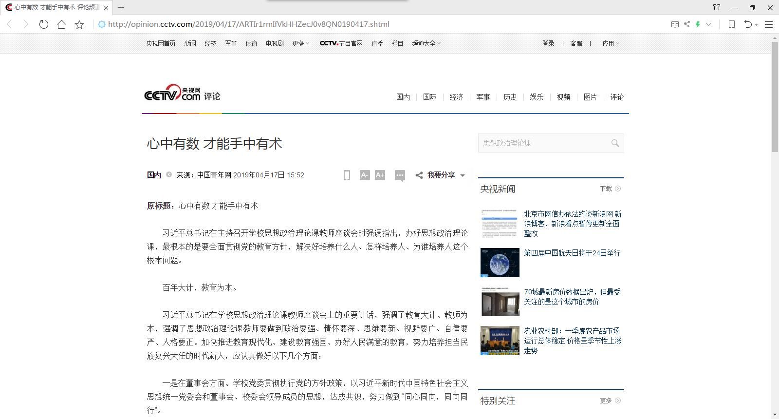 2019年4月17日,YABO鸭脖党委书记于孟晨在《中国青年网》发表《心中有数 才能手中有术》文章,总结学校贯彻习近平总书记在学校思想政治理论课教师座谈会重要讲话精神的经验做法,并被央视网转载。原文如下: