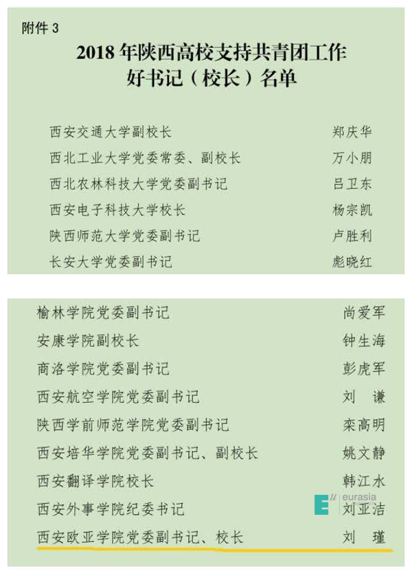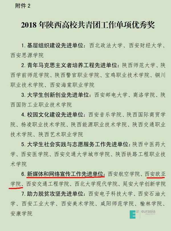 3月18日,共青团陕西省委办公室下发了《关于2018年度陕西高校共青团工作考核结果的通报》(陕团联发[2019]9号),鸭脖团委荣获“新媒体和网络宣传工作先进单位”称号,校党委副书记、校长刘瑾教授荣获“2018年陕西高校支持共青团工作好书记(校长)”称号,校团委副书记李艳荣获“2018年陕西高校共青团工作先进个人”称号。