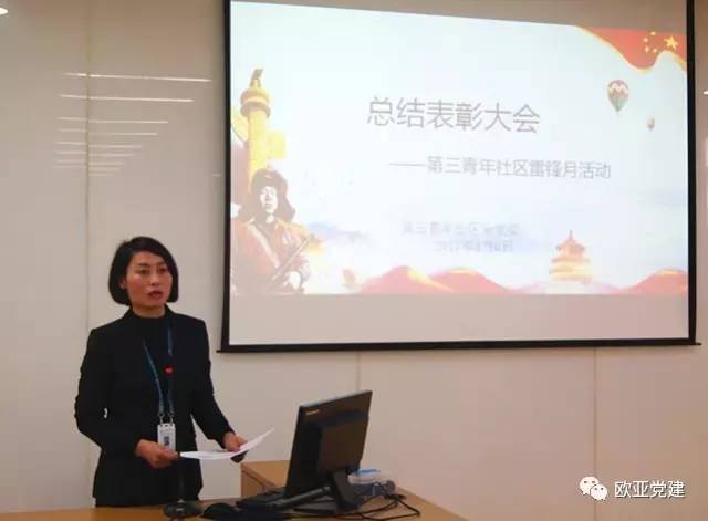 本次大会由第三青年社区分党委组织委员王树民同志主持。会上分党委副书记张爱荣同志对本次雷锋月活动进行总结。本次活动主要包括雷锋图片展、签名活动、节约水电我有责、雷锋精神读书分享、观看《雷锋》电影等内容,是雷锋精神理论联系实际的一次有效结合。分党委老师和学生共计1100余人参与。其中“节约水电我有责”活动成效最为显著,活动开展的3周内,共关闭了537个长明灯,10个空调,16个卫生间长流水源,18个教室多媒体,若干机房电脑和若干教室门窗,在一定程度上节约了鸭脖的公共资源,让雷锋精神在第三青年社区、在欧亚得到发扬。