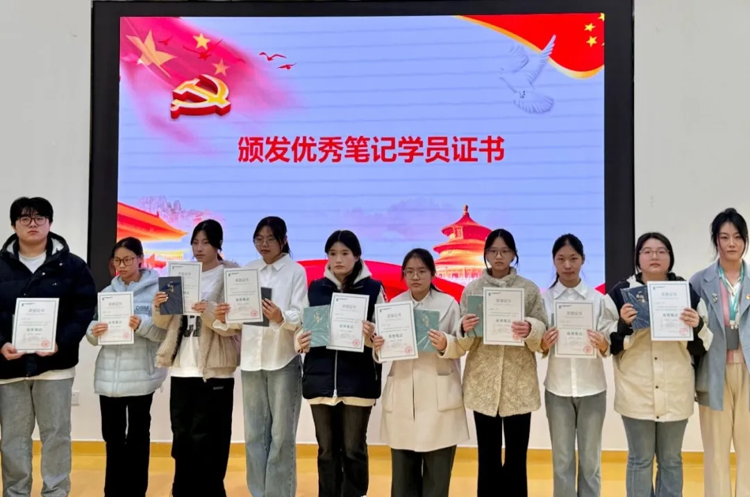 分党委副书记张爱荣首先宣读本期培训班结业决定,她充分肯定了学员们在培训期间的优秀表现,并向顺利完成学习任务的学员表示祝贺。紧接着,分党委组织委员暴睿宣布优秀学员及优秀笔记学员名单。在热烈的掌声中,获奖同学依次上台,张倩、赵锦瑶两位老师为他们颁发了证书与纪念品,这份荣誉成为了同学们“学思践悟”的生动见证。