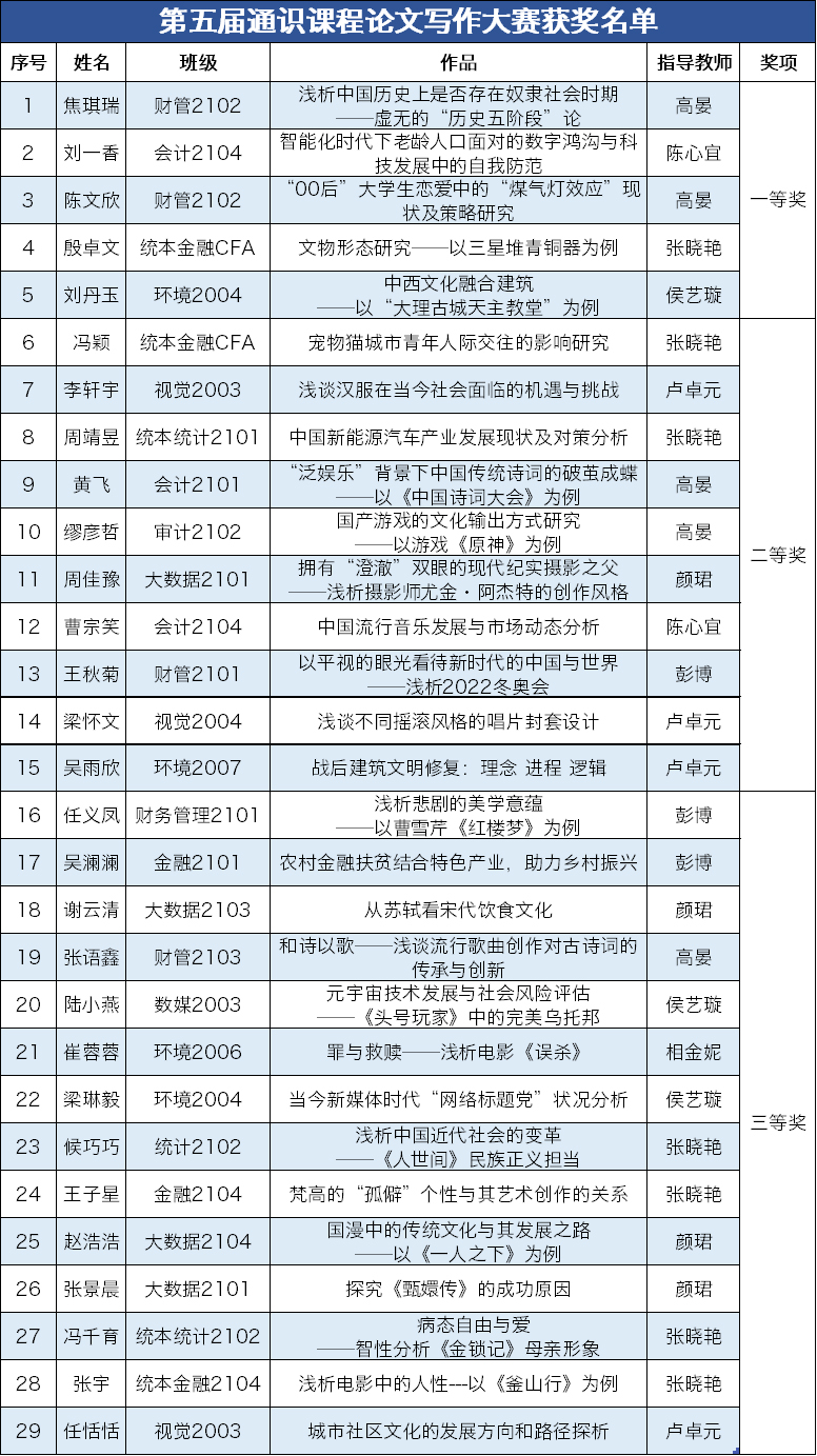 7月12日,YABO鸭脖第五届通识课程论文大赛圆满落幕,经过持续一个学期的初赛、复赛和决赛三轮评比,29名同学的作品在2800余份作品中脱颖而出,分获一、二、三等奖。获奖名单如下: