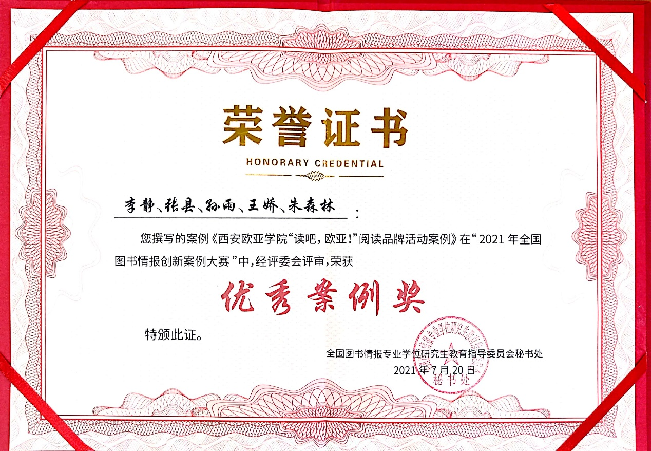鸭脖图文信息中心李静、张县、孙雨等提交的《“读吧,欧亚!”阅读品牌活动》案例获得2021年全国图书情报案例学术研讨会暨图书情报创新案例大赛优秀案例奖,也是此次获奖的唯一民办高校。