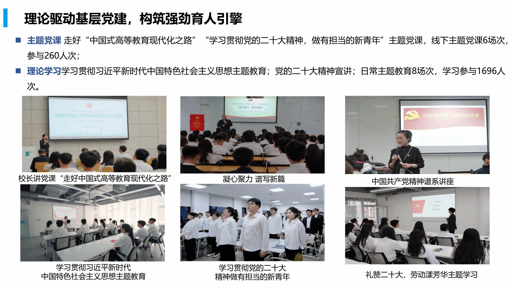 主题党课:走好“中国式高等教育现代化之路”“学习贯彻党的二十大精神,做有担当的新青年”主题党课,线下主题党课6场次,参与260人次;理论学习:学习贯彻习近平新时代中国特色社会主义思想主题教育;党的二十大精神宣讲;日常主题教育8场次,学习参与1696人次。