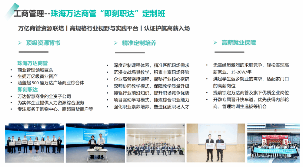 工商管理专业与珠海万达商管共创“即刻职达”定制班(隶属于工商管理专业),依托其丰富的行业资源与全球先进的管理经验,为学生提供充满可能性的学习与实践平台。作为万达智慧商业的全资子公司,“即刻职达”深度参与课程建设,采用“深度定制课程+沉浸实战场景”的教学模式,帮助学生更好地理解现代商业综合体的运营管理。