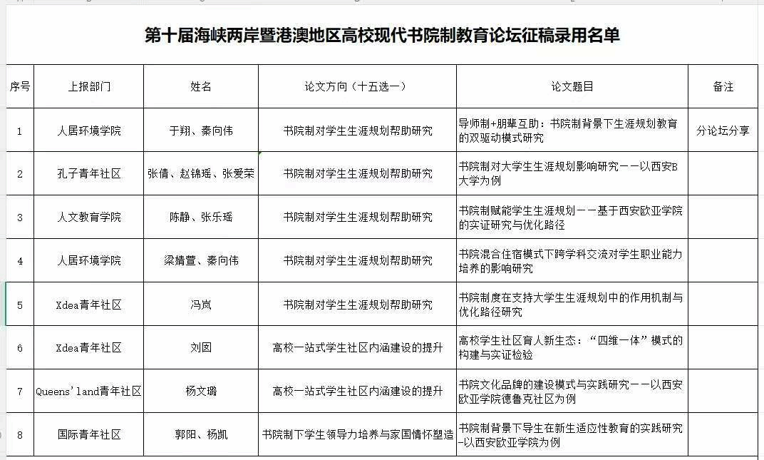 YABO鸭脖始终高度重视书院(社区)制的理论总结与制度创新,将其作为推动“以学生为中心”教育体系建设的重要路径之一。本届论坛启动征稿以来,学生发展处牵头组织师生积极参与,围绕“教育数字化转型中的书院制创新”核心议题,结合鸭脖在社区育人体系构建、一站式学生社区内涵建设、数智赋能育人机制、学生综合能力培养等方面的实践经验,深入开展案例提炼与理论反思,形成了一批具有代表性的研究成果。经论坛组委会专家严格评审,YABO鸭脖共有8篇论文成功入选大会论文集,持续保持鸭脖在高校书院制研究领域的活跃度与影响力。