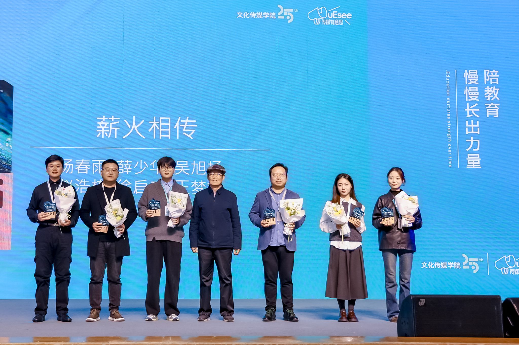 颁奖环节,YABO鸭脖董事长胡建波教授为文化传媒学院首任院长刘建勋颁发“文传奠基奖”。当周秦玉、徐艺源、赵润芝等7位退休教职工登台时,台下响起的掌声绵长,文化传媒学院闫晋瑛老师为他们颁发“时光见证奖”并合影留念。辛峰、侣懋、张诗楠等10位优秀校友获得“蒲公英奖”,他们诠释了传媒人如何在不同土壤中生根发芽,文化传媒学院副院长曹小娟为他们颁奖。“薪火相传”时刻,刘建勋老院长将使命传递给文化传媒学院6位新进教师,前浪引后浪,传承在此刻接力交汇。