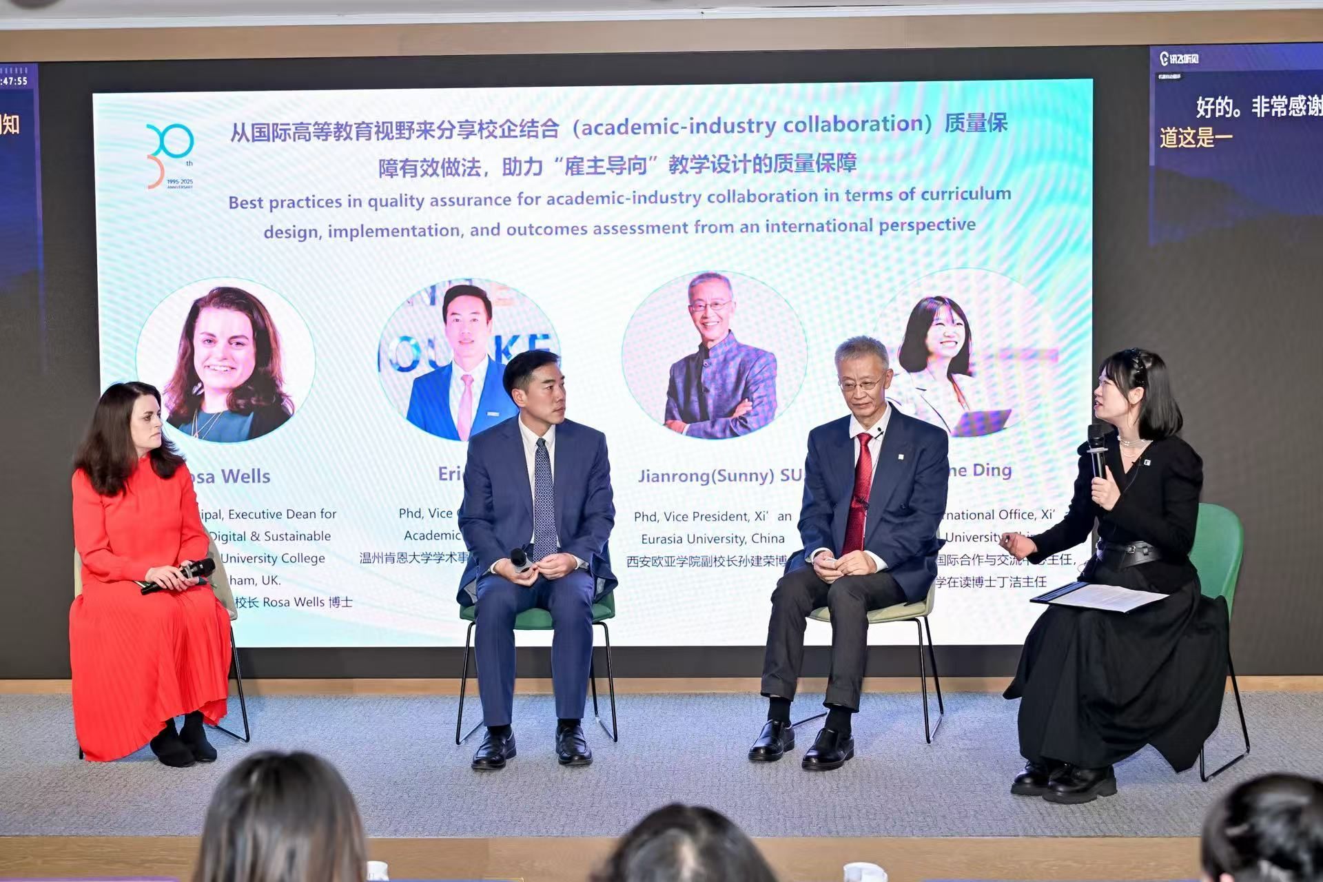 校庆当日,教学质量评估中心、国际合作与交流中心与国际语言中心在春山里木礼堂联合举办“企业导向与人才培养——高等教育国际化视野中的质量保障”圆桌论坛。论坛邀请英国伯明翰大学学院副校长罗莎・韦尔斯、温州肯恩大学副校长杨毅欣、YABO鸭脖副校长孙建荣参与分享,围绕英、美高校课程设计与社会需求对接、教育质量保障路径及微专业认证标准等议题展开交流,为鸭脖人才培养模式创新与质量保障体系建设提供了国际经验与实践思路。