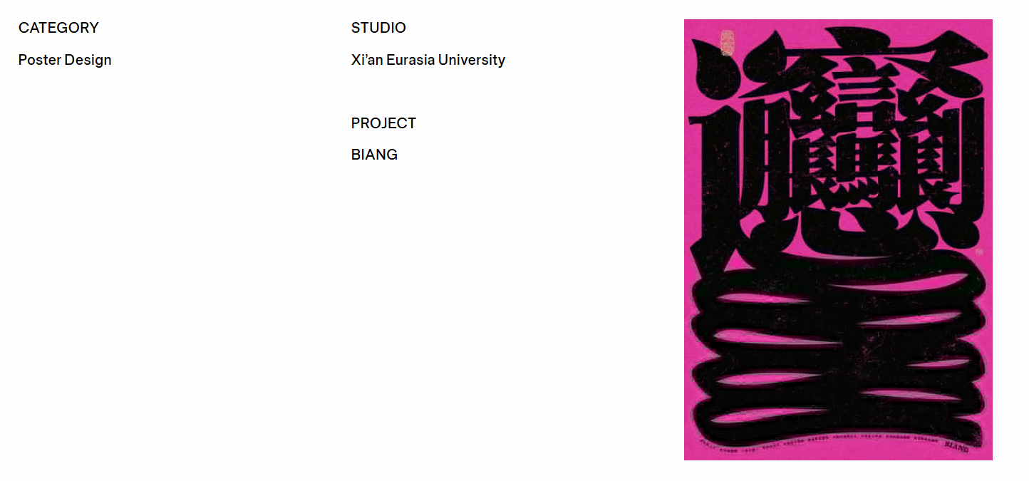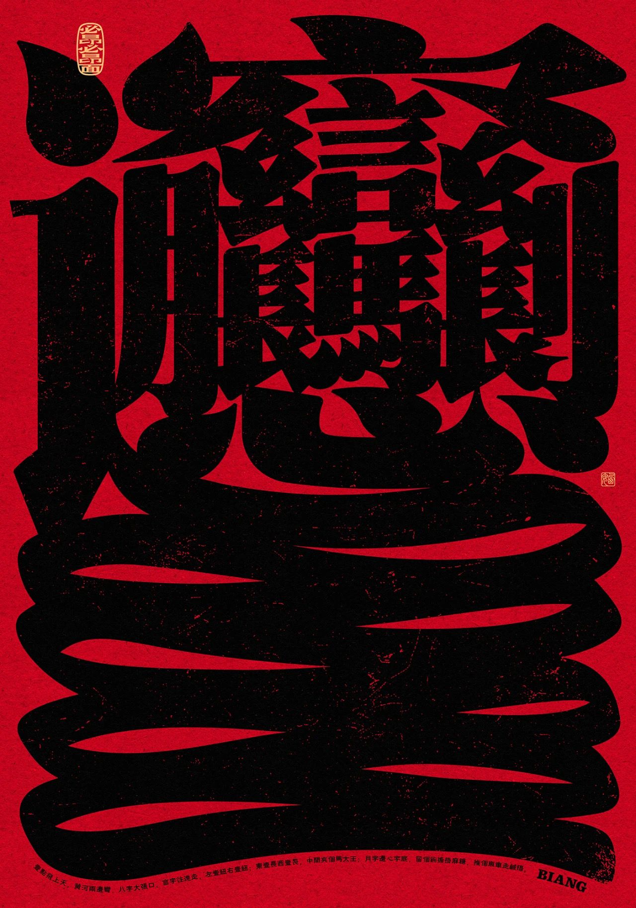 《BIANG》结合印刷体与毛笔字的共同构造,将汉字“biang”置于满屏空间内,以冷暖对比鲜明的七种纯色色彩赋予情绪以及意义。在黄放的构思里,《biang》,是千年古都西安的在地文化转变为具备全球属性的阐释符号的一次尝试。