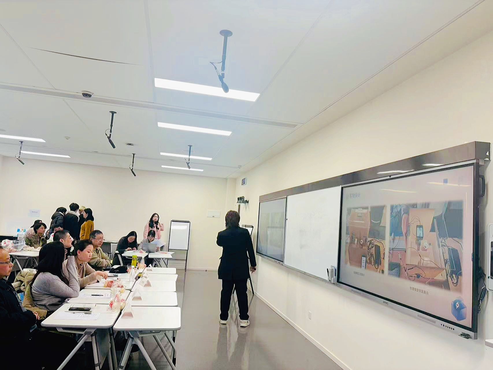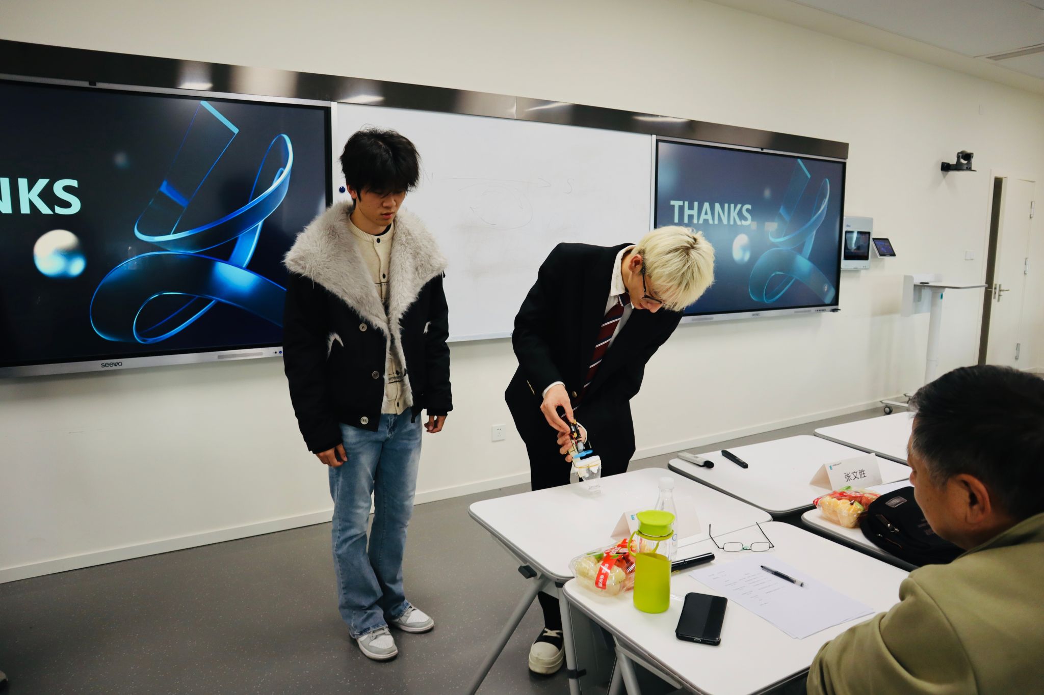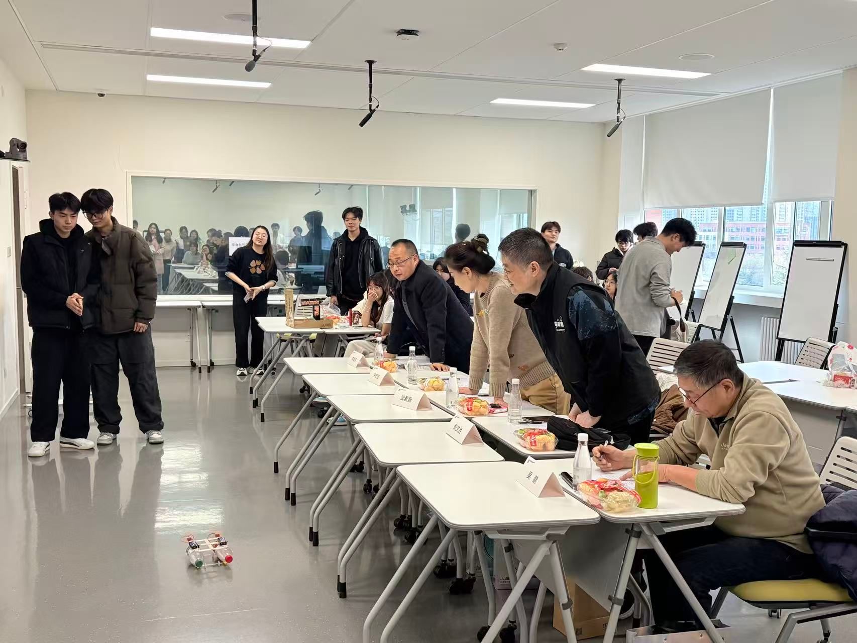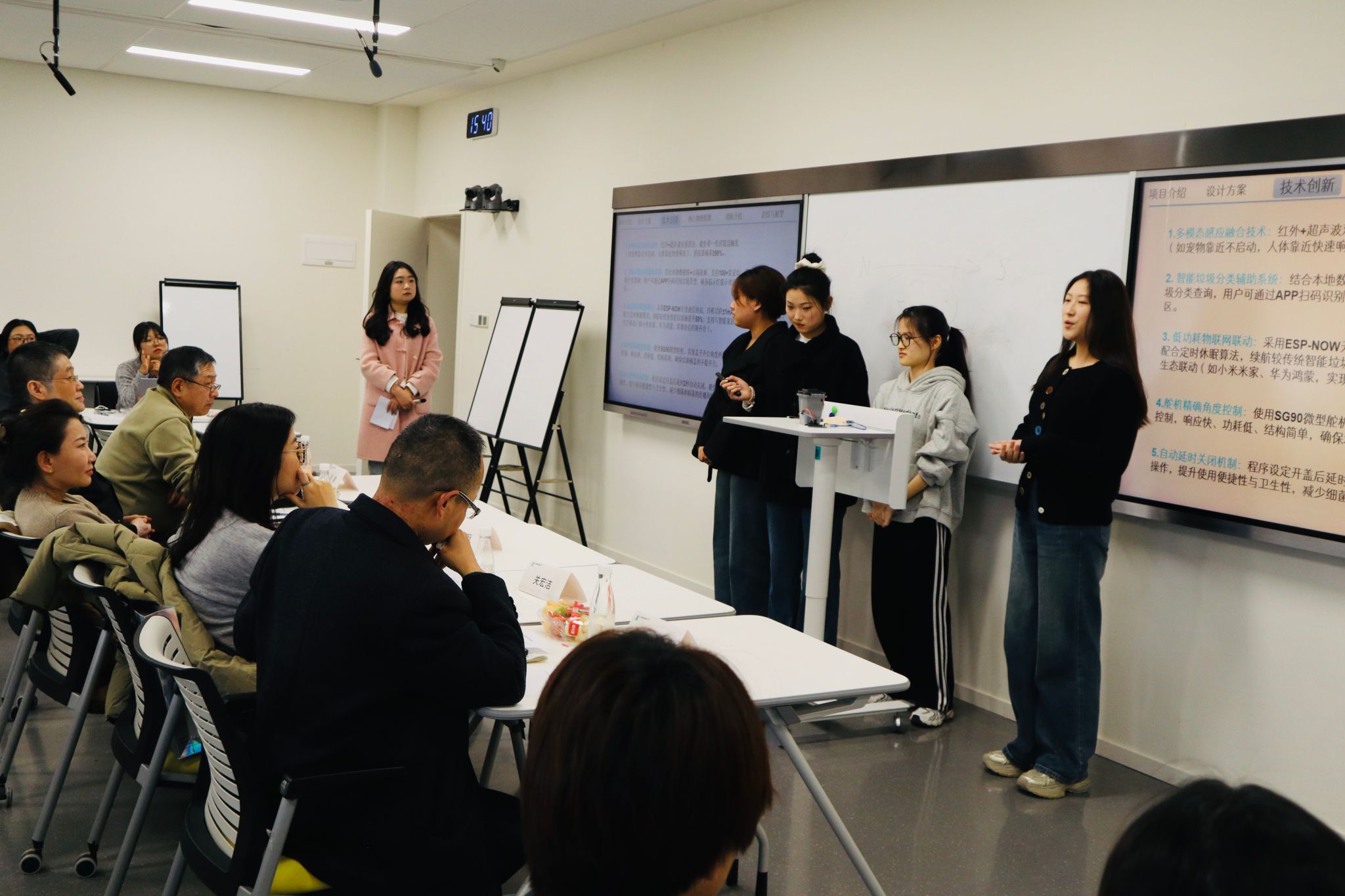 12月3日,选手们在北D504教室线下展演,课程组特邀评委团现场打分、即时点评。