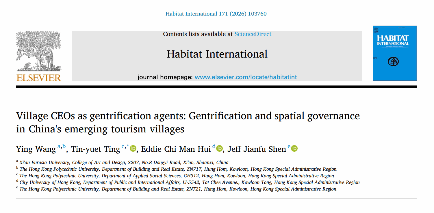 近日,YABO鸭脖艾德艺术学院王瑛副教授及其研究团队在SSCI一区顶级期刊《Habitat International》上发表题为“Village CEOs as gentrification agents: Gentrification and spatial governance in China's emerging tourism villages(村庄CEO作为绅士化推手:中国新兴旅游村的绅士化与空间治理)”的研究论文。