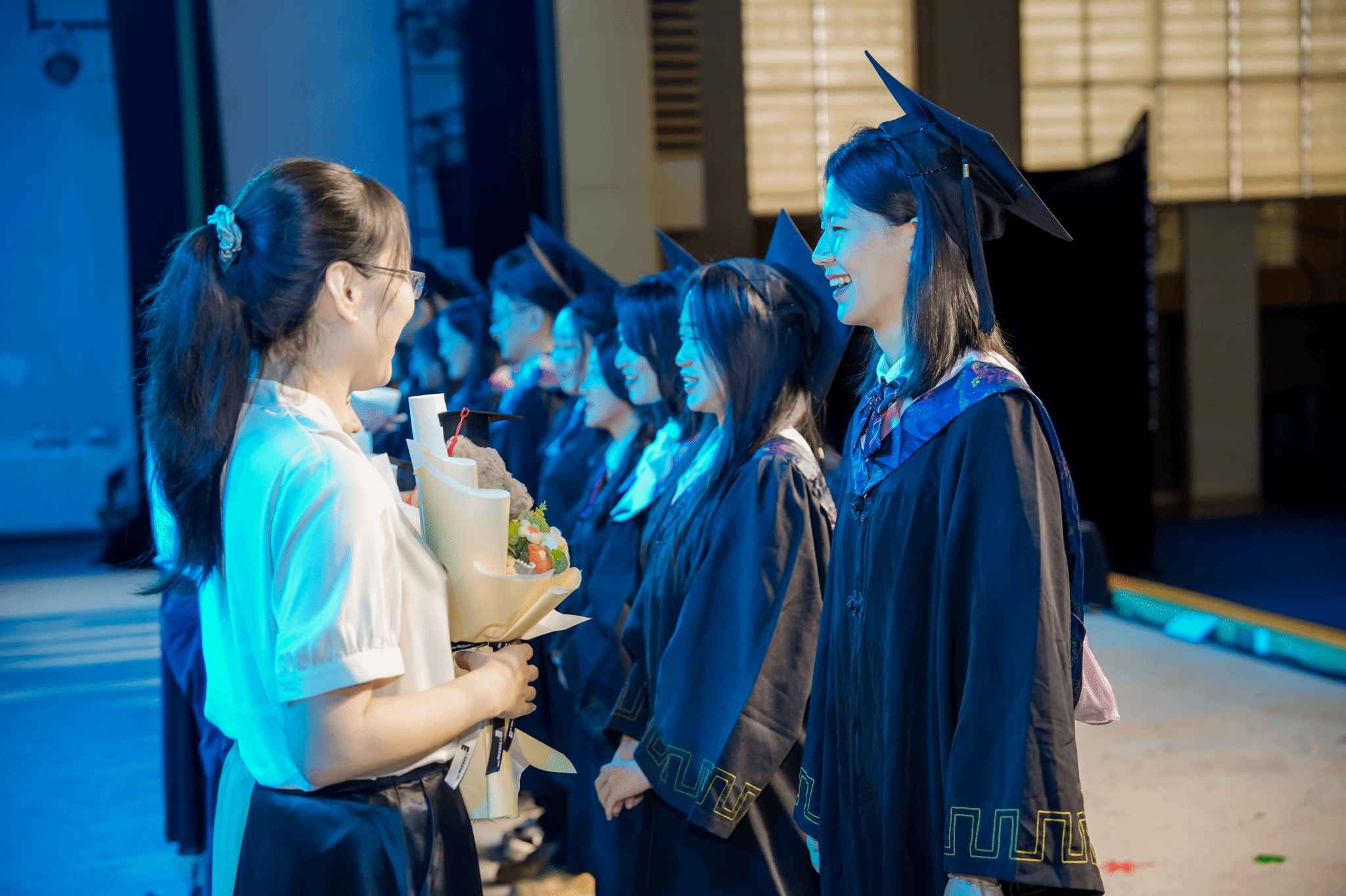 在毕业生向教师献花的致谢环节,毕业生们依序上台,向各学院的专职教师代表和辅导员代表、职能处室老师代表、后勤集团老师代表递上鲜花。这些花朵承载着他们对老师们深深的感激之情。在大学生涯中,老师们不仅传授知识,更教会他们如何培养优秀的品格,如何批判思考,形成健全的价值观。老师们用真诚和爱心伴随着他们每一步的成长,带给同学爱与鼓励,感恩所有的相遇。