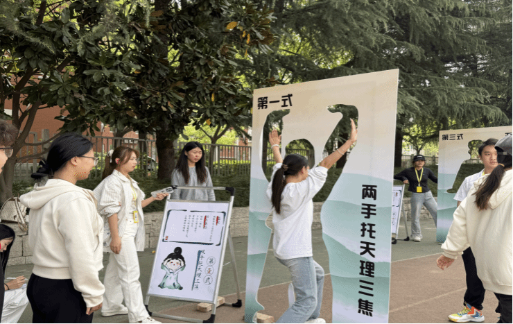 本次决赛突破常规,将传统八段锦与现代创意结合,特别设置八段锦招式人形立牌作为比赛参照标准。参赛者需精准完成“两手托天理三焦”“左右开弓似射雕”等经典招式,既考验动作规范性,又融入文化传承深意。