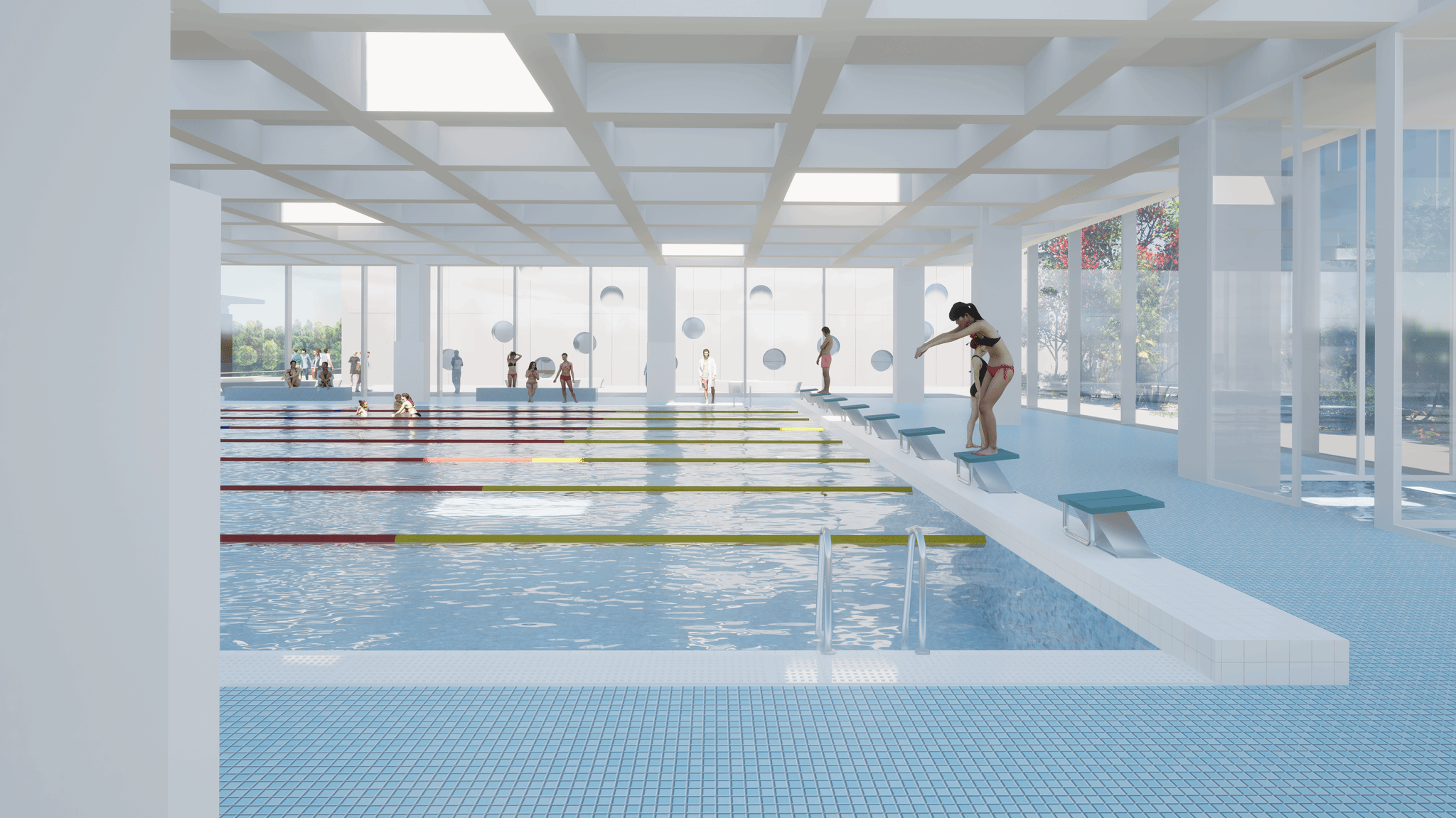 功能性方面,游泳馆保证各功能区在整个空间中合理布置,彼此通过精心规划的交通流线高效连接,确保使用者在建筑内的移动便捷且有序。同时游泳馆的隔音、排水、通风等功能设施,设计科学合理,满足人们在游泳过程中的需求。