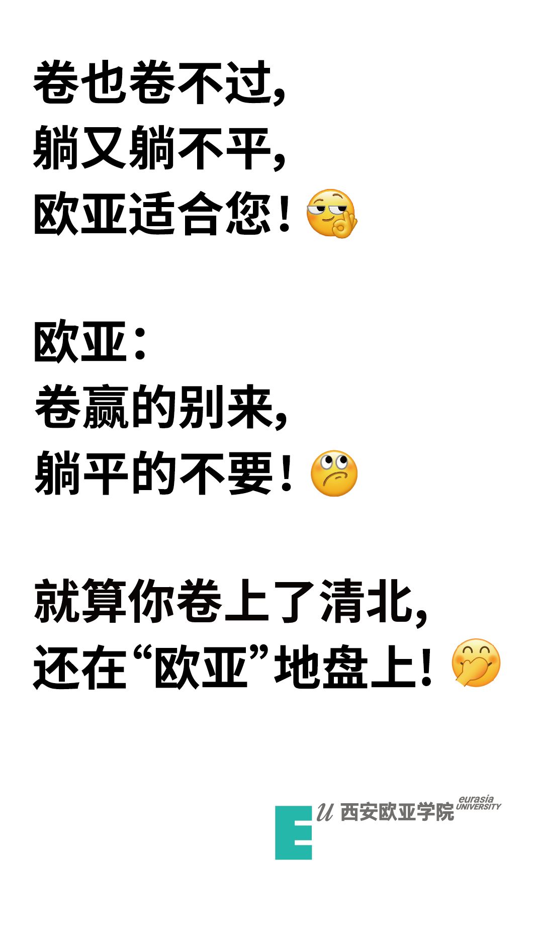 要是卷的话,任何人卷下去都是受不了的,哪怕你考了全省状元,进了最好的大学,你会发现那里还有一大批状元等着你,你还得继续跟别人卷,考博士,考哈佛、耶鲁......继续卷,不断跟别人进行比较,争取好名声、好地位、好工作。其实,没有人能够完全卷下去。既然你不想过那么卷的人生,也不可能完全躺平,那就到欧亚来,这里一直提倡做自己。