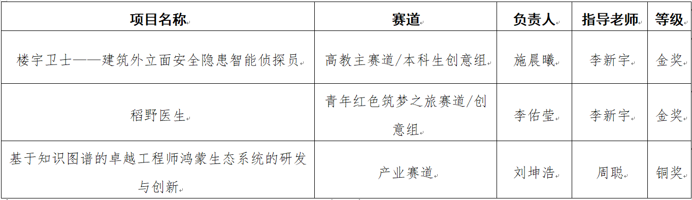 经过长达三个月的激烈角逐,我院《楼宇卫士——建筑外立面安全隐患智能侦探员》团队荣获高教主赛道本科生创意组省级金奖;《稻野医生》团队荣获青年红色筑梦之旅赛道创意组省级金奖;《基于知识图谱的卓越工程师鸿蒙生态系统的研发与创新》团队荣获产业赛道省级铜奖。