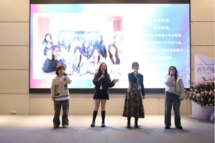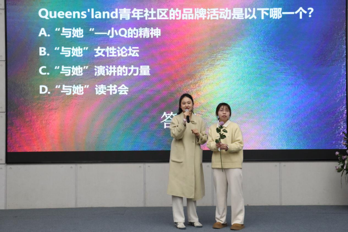 王亚楠老师和孙傲然老师分别让学生从花海中随机抽取花,每个花代表着对应的人。当名字被一一念出时,老师向她们提问。在这一过程中,无论是老师幽默风趣的引导,还是学生们古灵精怪的回答,都让现场的氛围如春日暖阳下的花海一般,明媚、欢快且轻松无比。师生之间的互动自然流畅,仿佛不是在进行一场问答活动,而是一场温馨愉悦的聚会。