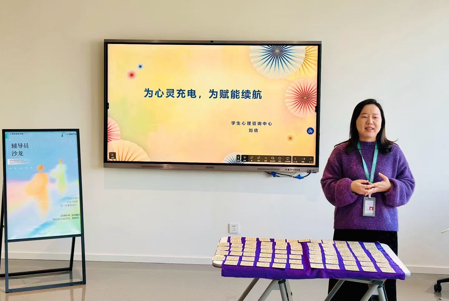 在最后的“我的能量图谱”环节,辅导员摆放抽取的三卡,串联成一段完整的温暖旅程,并为这幅独特的图谱赋予一个充满正能量的名字。整个画面不仅记录下了这次活动的美好收获,也成为了每位老师心中一份珍贵的记忆。