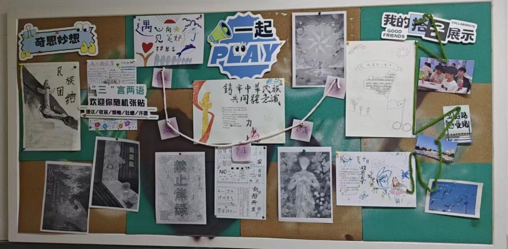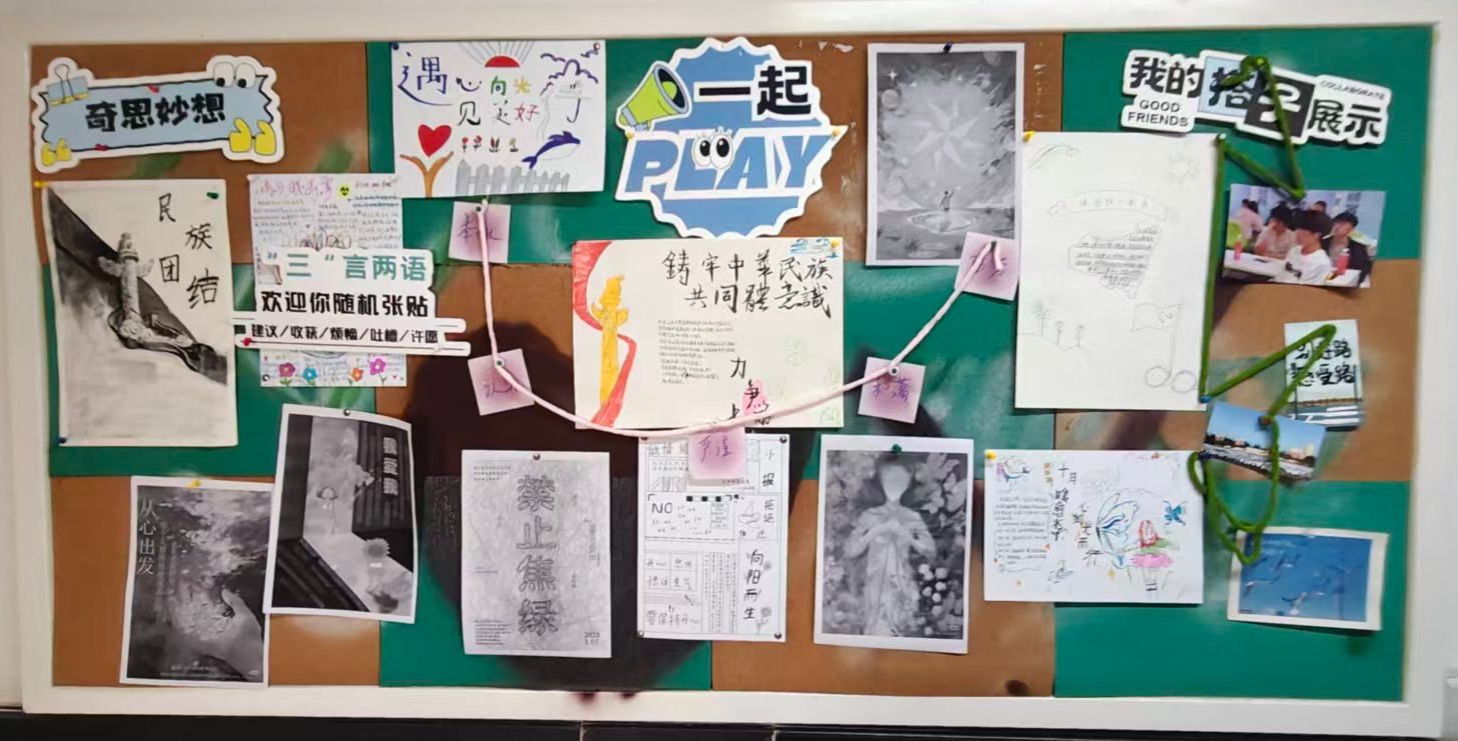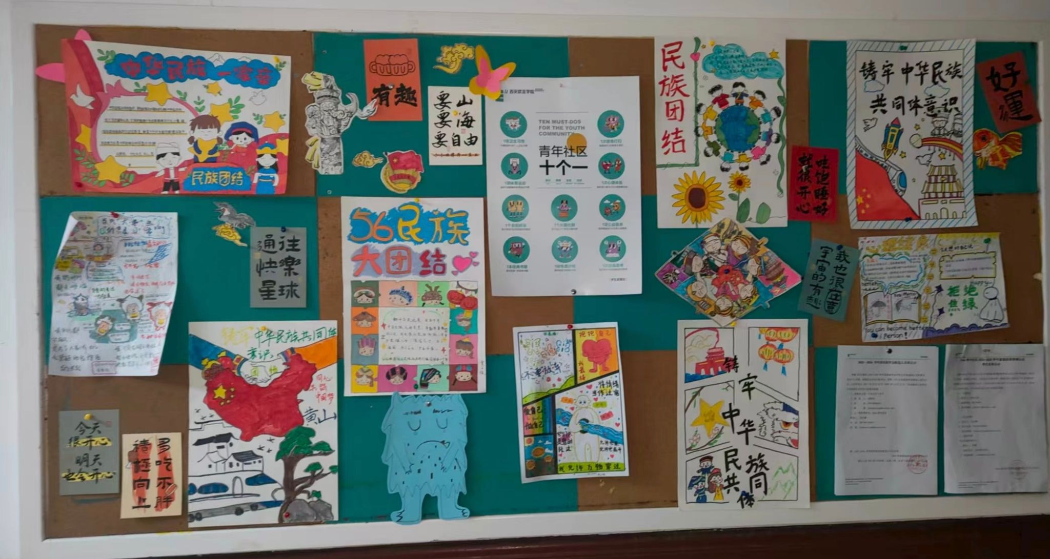 Xdea青年社区以“民族团结,民族共同体意识”为主旨,把促进民族团结写在软木板上——这里不见冗长的讲义,唯有五十六种色彩同时点亮的瞬间。放眼望去,棕色衬底之上,红色炽烈,绿色清新,蓝色澄澈,各色交织成圆,犹如涟漪荡漾,将“我们是一家人”的暖意,轻轻沁入每个人心底。