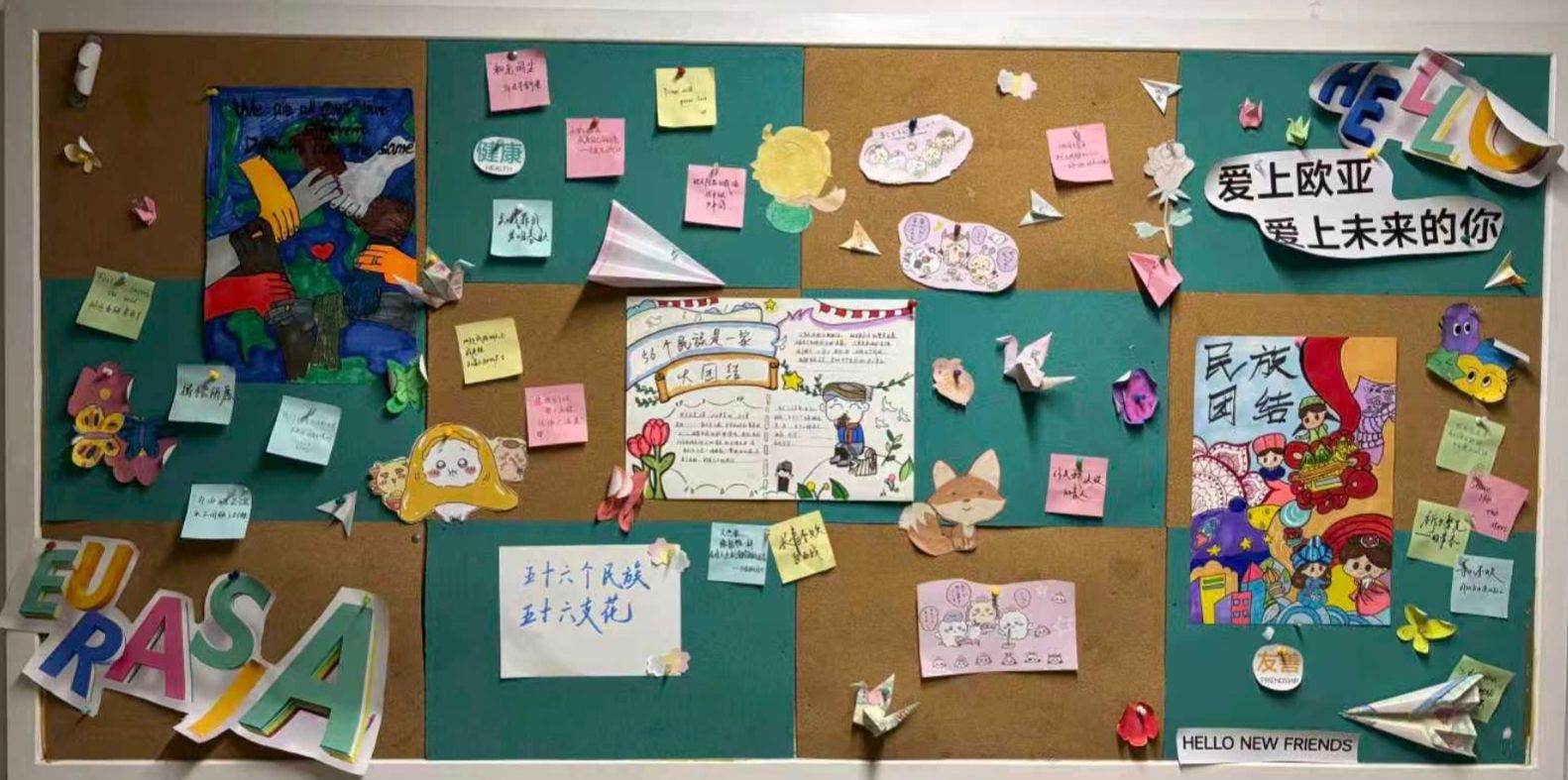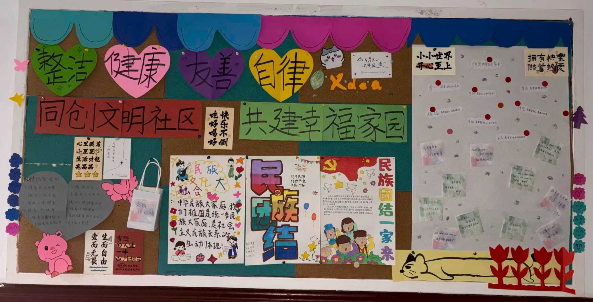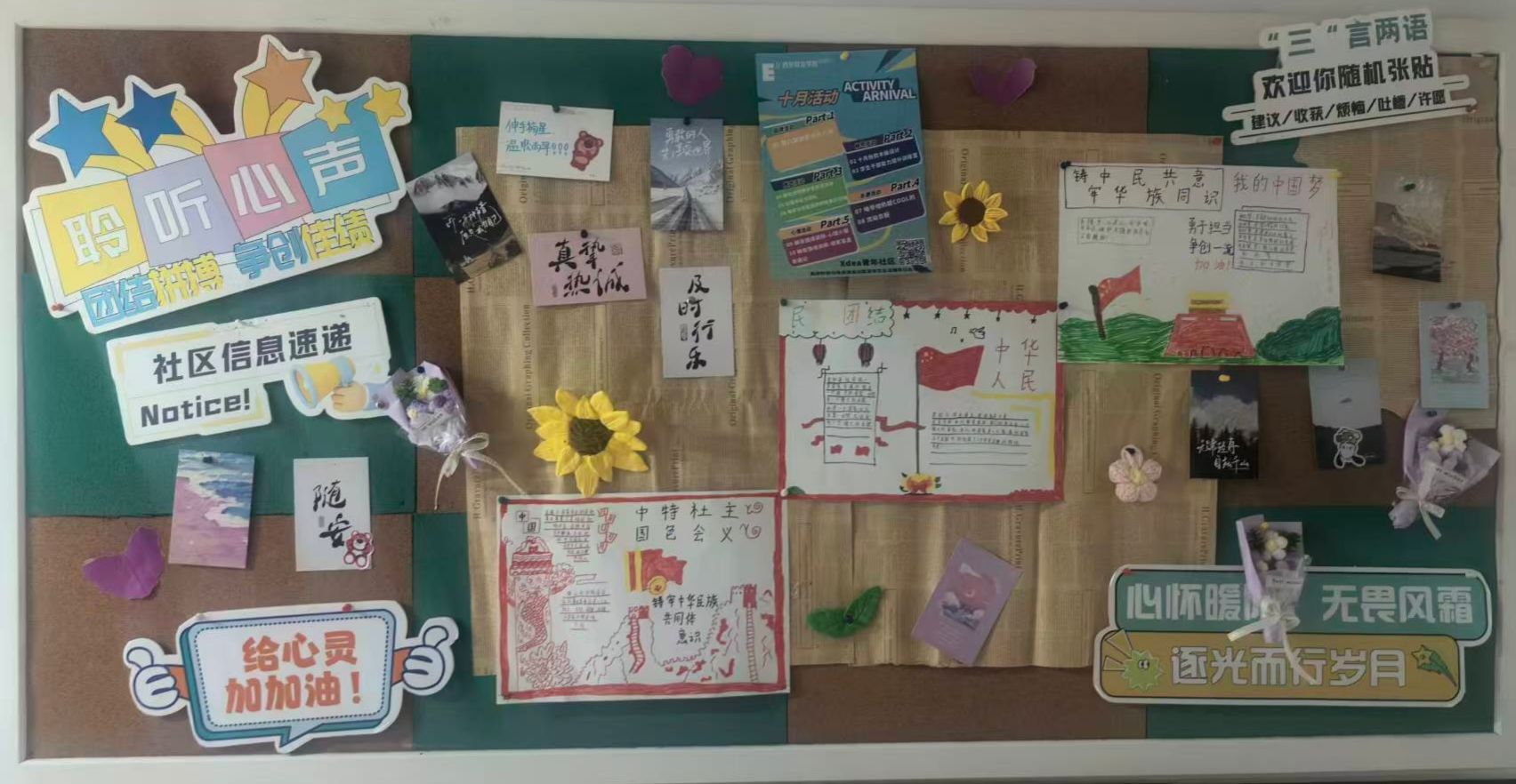 Xdea青年社区以“民族团结,民族共同体意识”为主旨,把促进民族团结写在软木板上——这里不见冗长的讲义,唯有五十六种色彩同时点亮的瞬间。放眼望去,棕色衬底之上,红色炽烈,绿色清新,蓝色澄澈,各色交织成圆,犹如涟漪荡漾,将“我们是一家人”的暖意,轻轻沁入每个人心底。