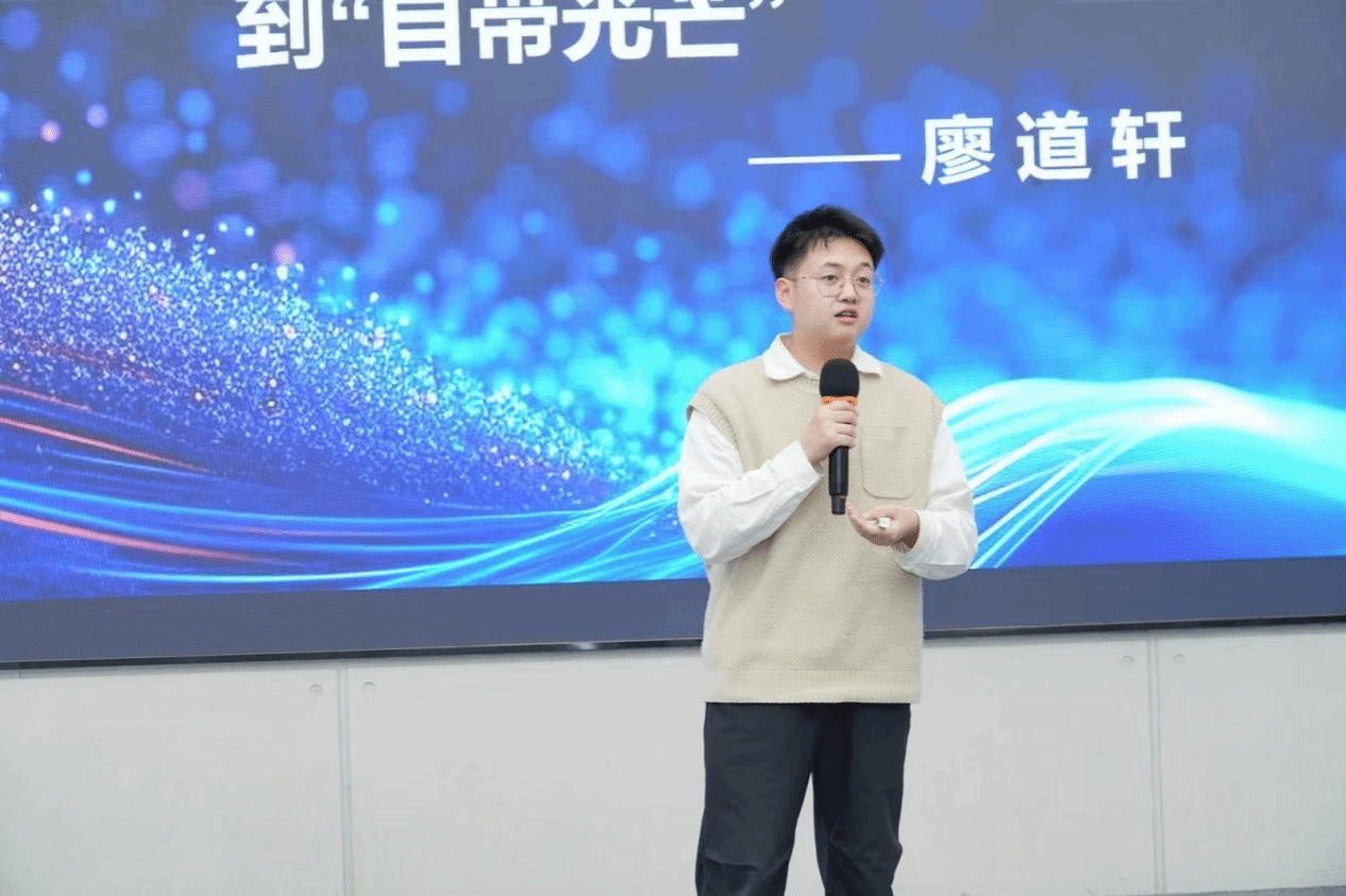 廖道轩同学用轻松幽默的脱口秀分享成长,讲述了自己从内向到投身志愿服务与学生工作的转变。在师友的鼓励与包容中,他勇敢突破、承担责任,逐渐找到自信与方向。他的故事,正是一场关于成长、陪伴与发光的温暖见证,让青春在坚守与热爱中绽放耀眼光芒。
