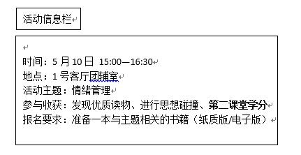活动简介:“心之所享”系列读书会是由欧亚心理项目组主办的一项读书会形式的心理健康活动。选择贴近同学们生活的议题作为主题,以期为同学们提供阅读交流平台的同时,也能帮助同学更好的解决实际问题。