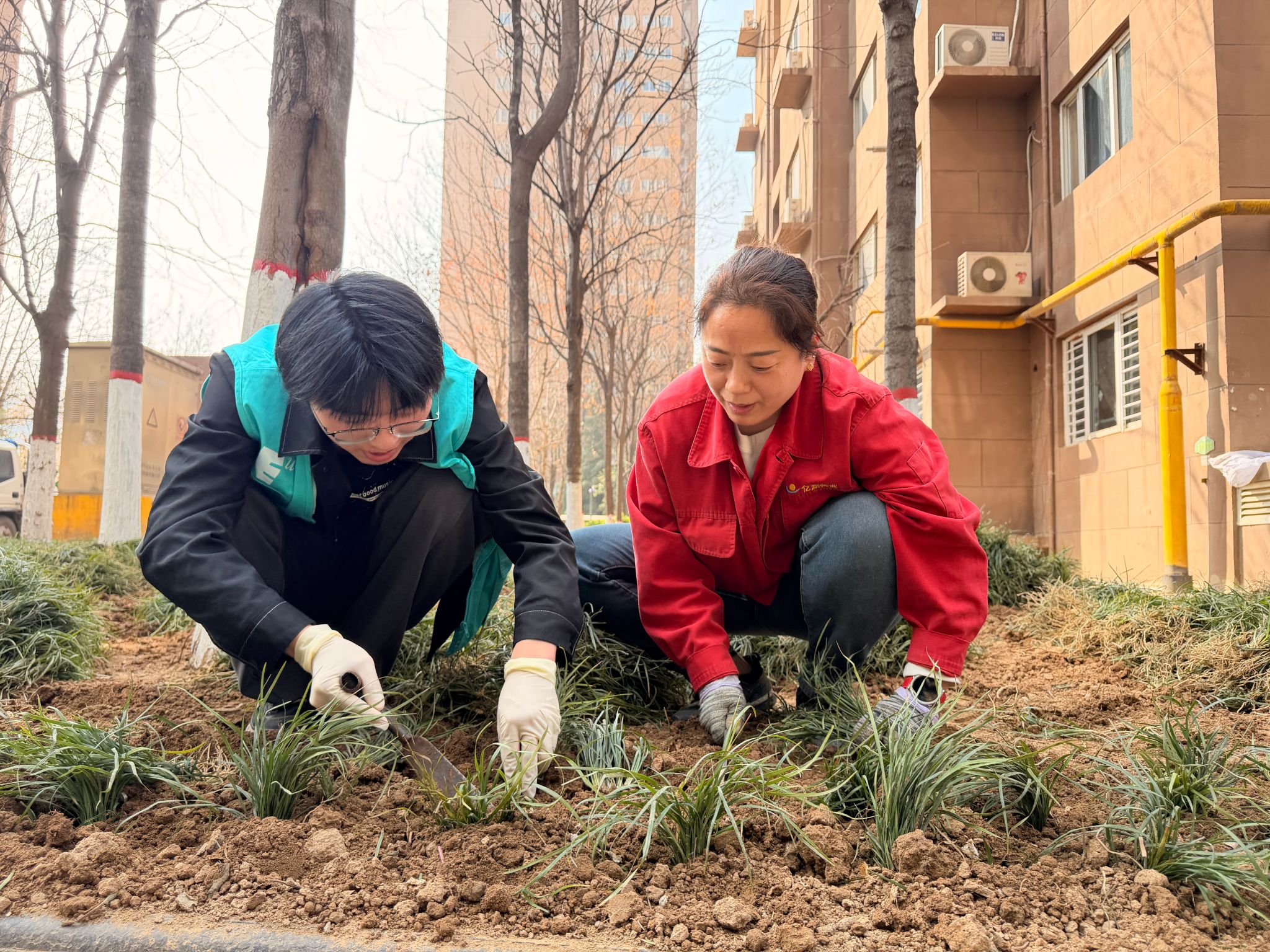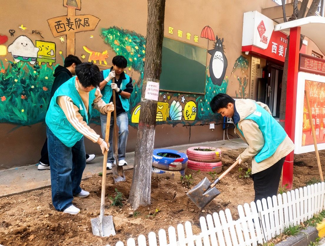 本次活动选址西姜欣居社区公共绿化区域。活动现场,同学们热情高涨,挥锹铲土、撒籽铺草、挖坑定植,每一个环节都一丝不苟——从草地的悉心铺设,到玫瑰的精心栽种,劳动的身影与初绽的花蕾相映成趣。经过一下午的辛勤劳动,新栽草木迎风挺立,为西姜欣居社区增添了一抹盎然生机。