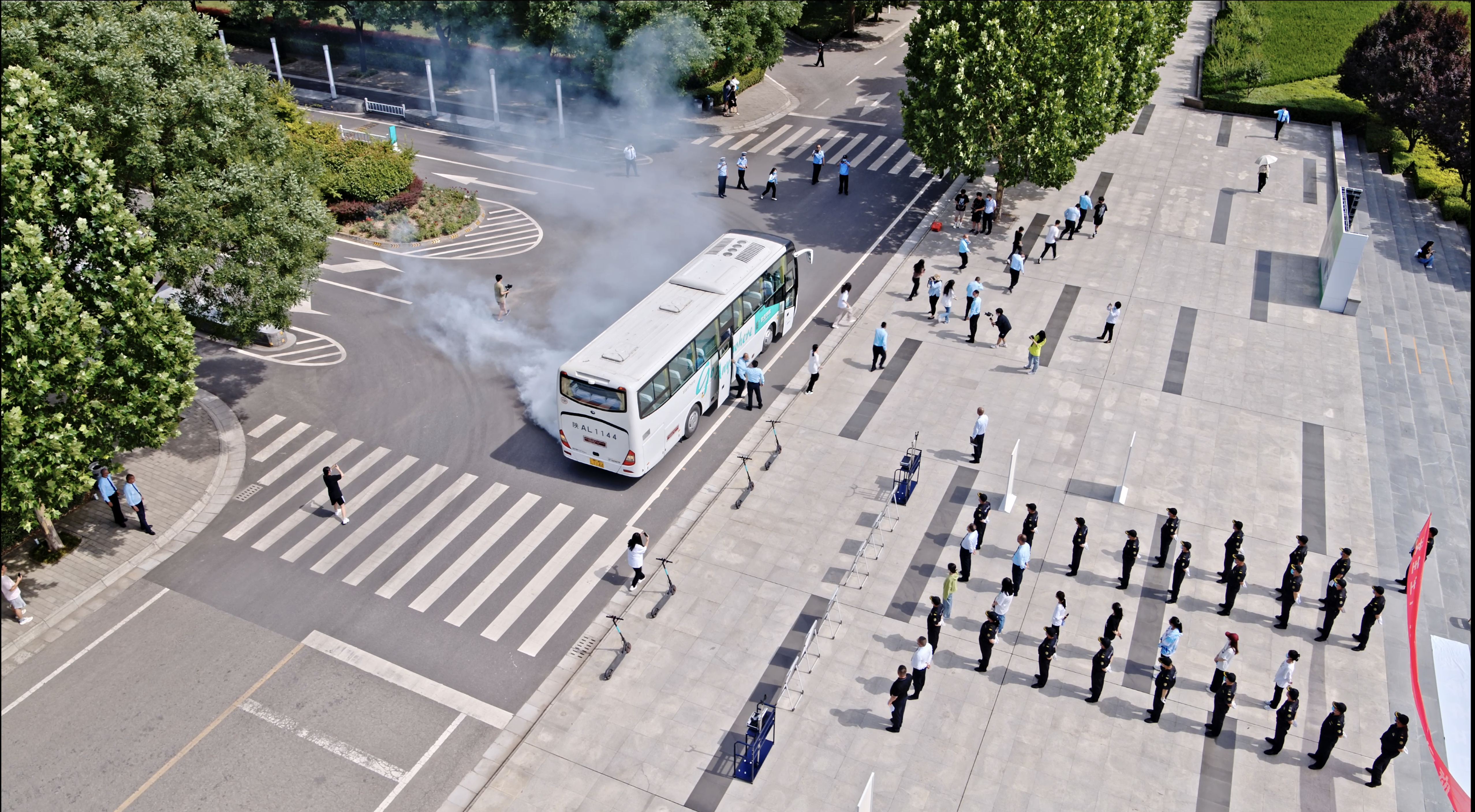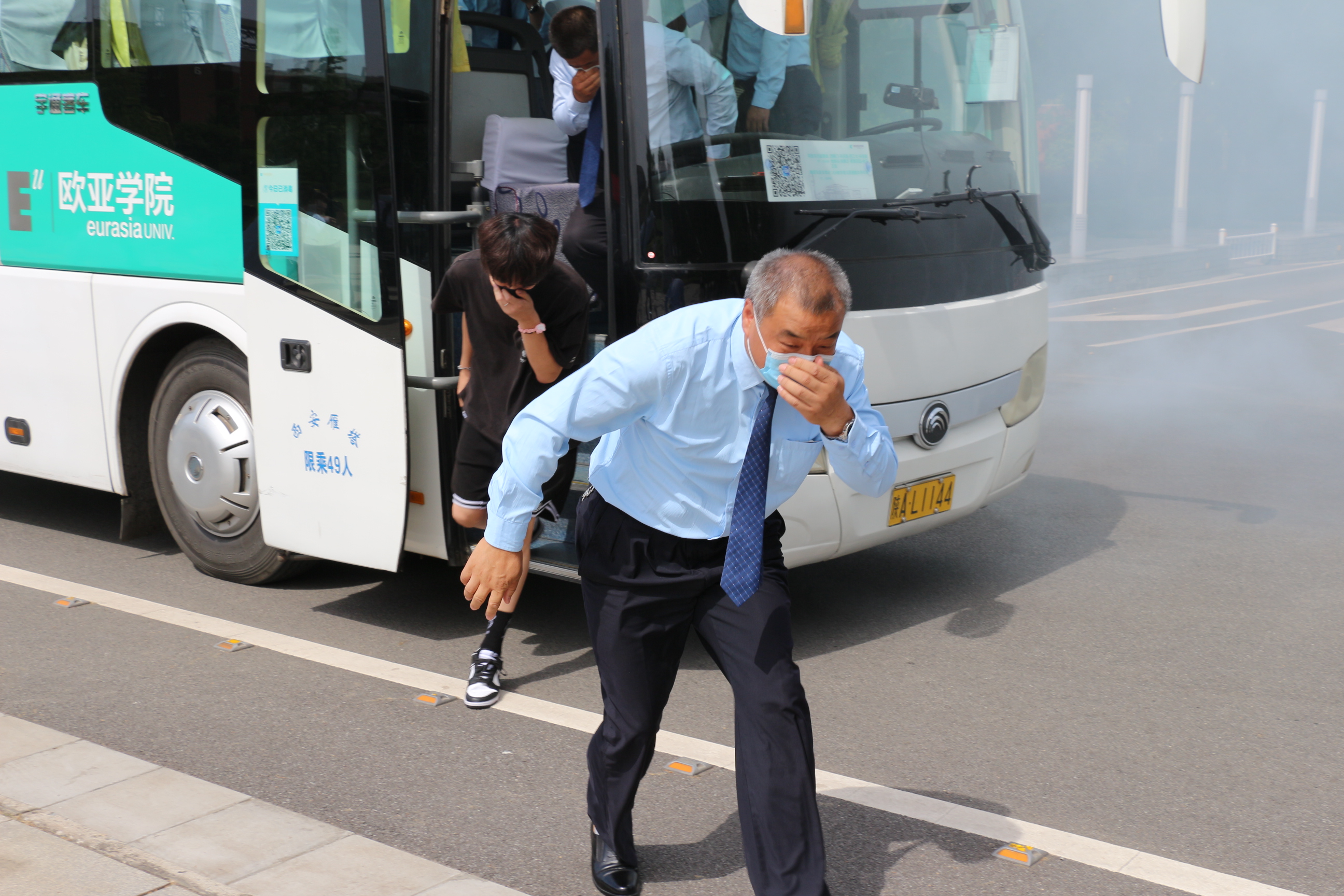 (图六-七:正在行驶车辆突发“火情”,模拟逃生演练现场