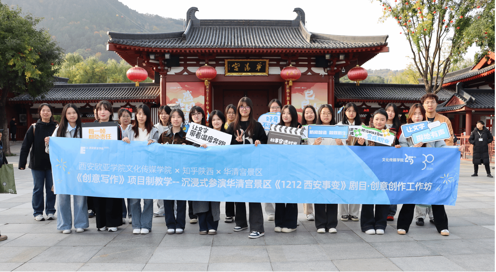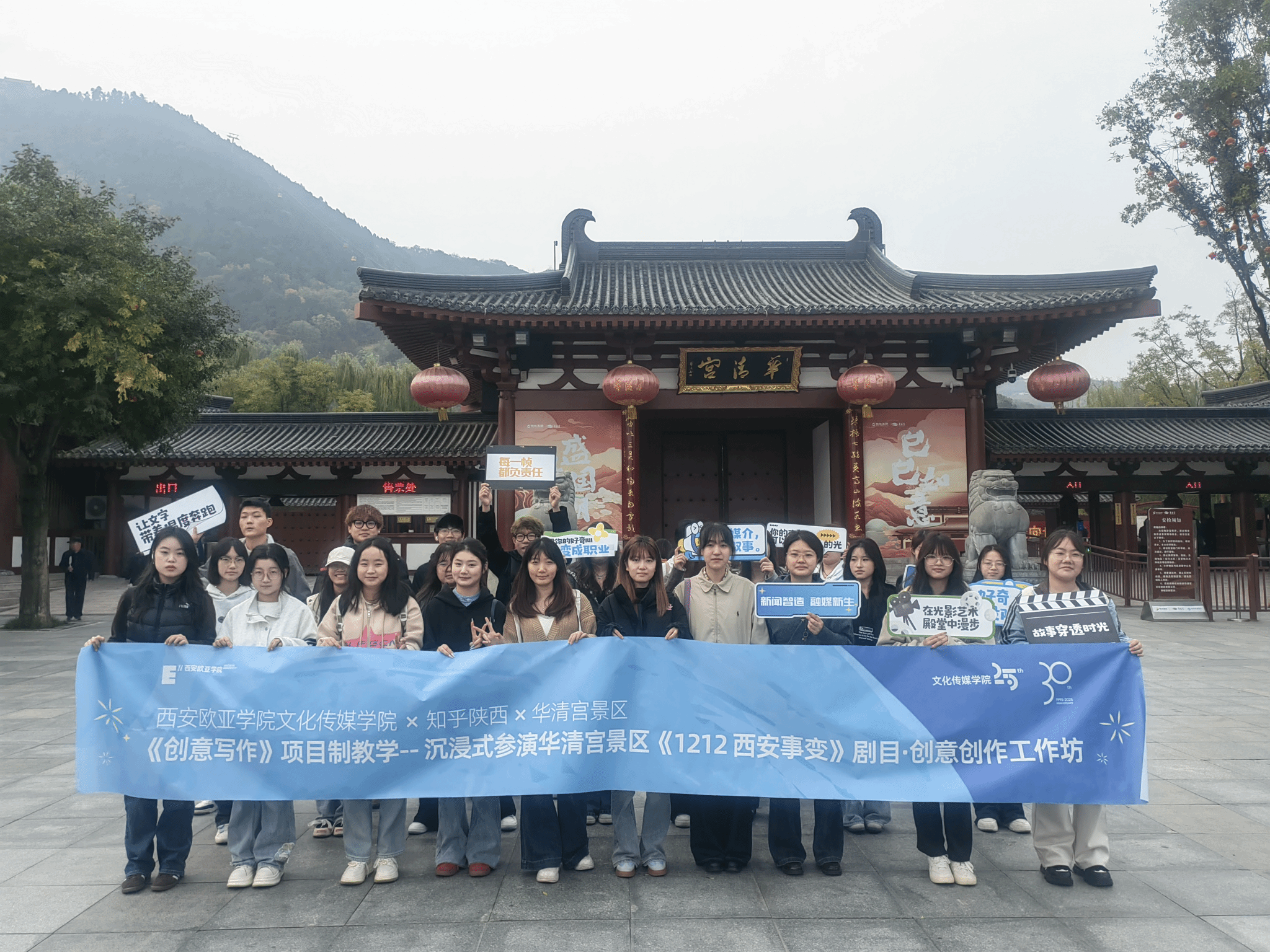 10月30日至11月1日,YABO鸭脖文化传媒学院新闻学专业联合知乎陕西运营中心、华清宫景区,组织新闻学2024级学生走进华清宫景区,开展了一场别开生面的《创意写作》课程实践教学活动。本次活动以国家级文旅IP——《1212西安事变》沉浸式影画剧目为载体,通过“沉浸式参演+创意内容转化”的项目制教学、工作坊教学模式,让学生从“旁观者”变身“参与者”,在历史现场激活五感,在创意实践中重构叙事,实现“历史活化”与“Z世代叙事创新”的双向奔赴。