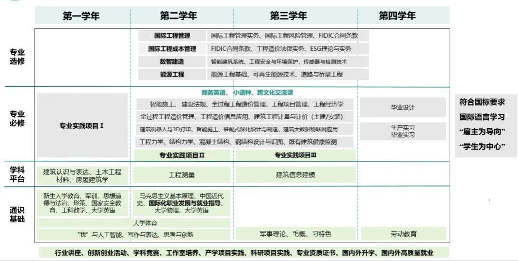 1.创新定制化培养模式:以企业需求为导向,人居环境学院试点“2.5+0.5+1”培养模式——2.5年完成专业基础与语言培训(开设法语、日语小语种课程,强化工程英语、商务英语)、0.5年开展企业标准实训(融入广联达、Tekla等工程工具及OSHE职业健康安全培训)、1年海外带薪实习(实习月薪6000-8000元),2025届参与该模式的毕业生岗位适配率达92%,有效提升了学生的就业竞争力。