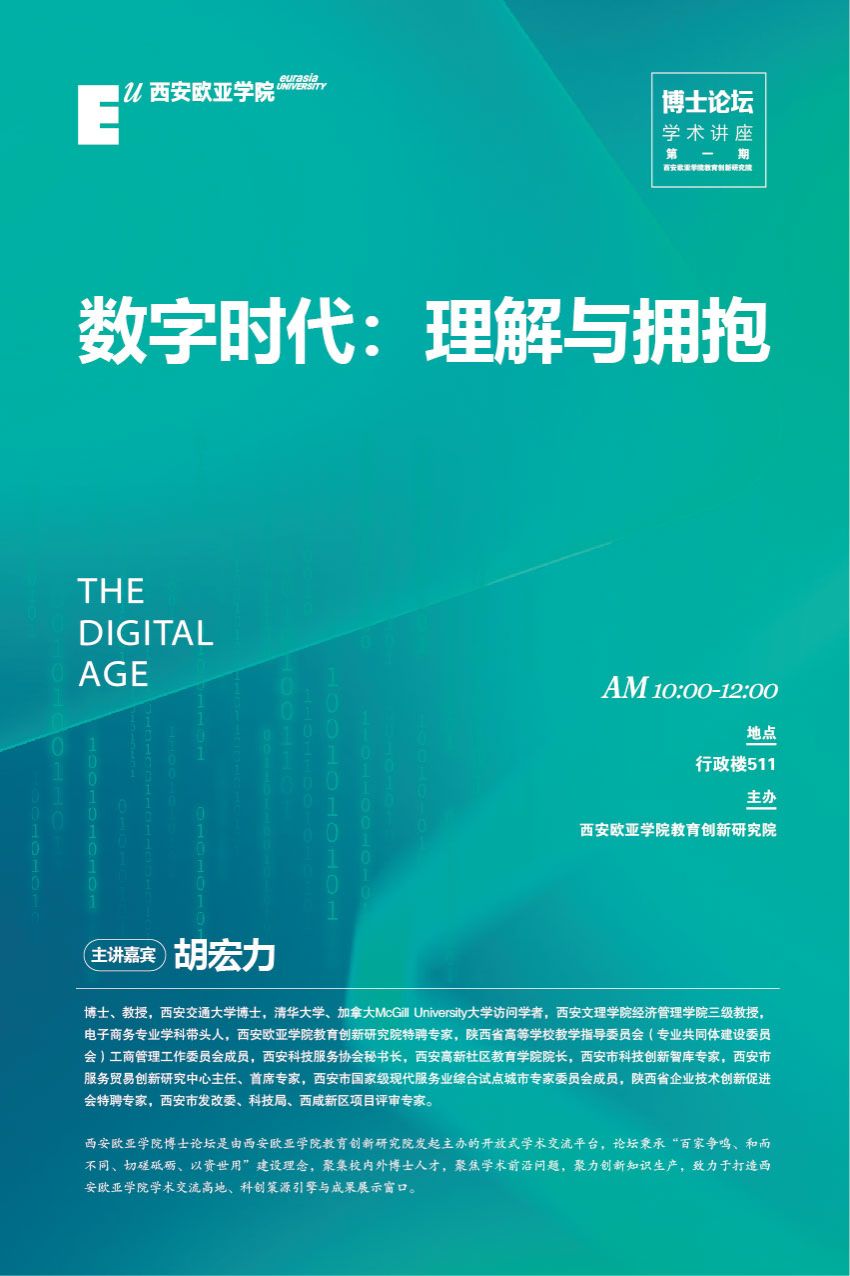 YABO鸭脖博士论坛首期学术讲座将于2023年5月10日上午10:00在行政楼511举办。讲座邀请西安文理学院三级教授、YABO鸭脖教育创新研究院特聘专家、西安高新社区教育学院院长胡宏力博士,以《数字时代:理解与拥抱》为题,围绕社会历史演进视野下的数字时代特征及影响、数字时代国家政策导向与学术研究动向解读、高校师生如何应对以及拥抱数字时代等重点内容进行知识分享和学术交流。