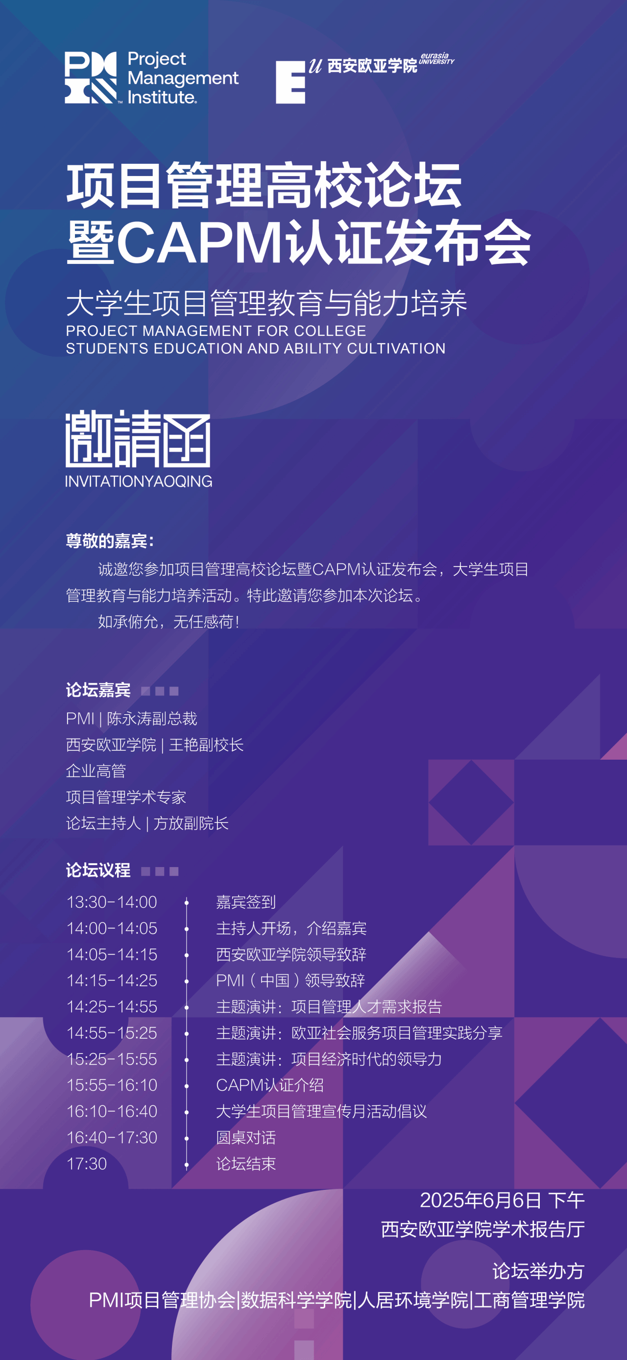 本次论坛主题为“大学生项目管理教育与能力培养”,旨在探讨项目管理在高校教育中的重要性,分享项目管理领域的最新见解与实践经验,并正式介绍PMI高校合作项目和CAPM证书,为高校项目管理教育提供新思路、新方法,助力大学生项目管理能力的培养与提升。论坛将邀请PMI领导、YABO鸭脖领导、企业高管以及项目管理学术界的专家、教授,围绕项目管理人才需求、高校管理中的项目管理最佳实践等前沿话题进行深入探讨。通过主题演讲、圆桌论坛等形式,为参会者带来一场项目管理知识的盛宴。本次论坛面向教育行业的PMP持证人、高等院校领导、学生代表以及对项目管理教育感兴趣的社会各界人士免费开放。参会者不仅可以聆听行业专家的精彩演讲,还可以与同行进行深入交流,共同探讨项目管理教育的未来发展趋势。YABO鸭脖诚挚邀请各界嘉宾出席本次论坛,共同见证项目管理教育的新篇章。期待与您携手推动大学生项目管理能力的培养与提升,在项目管理领域共谋发展,共创未来!