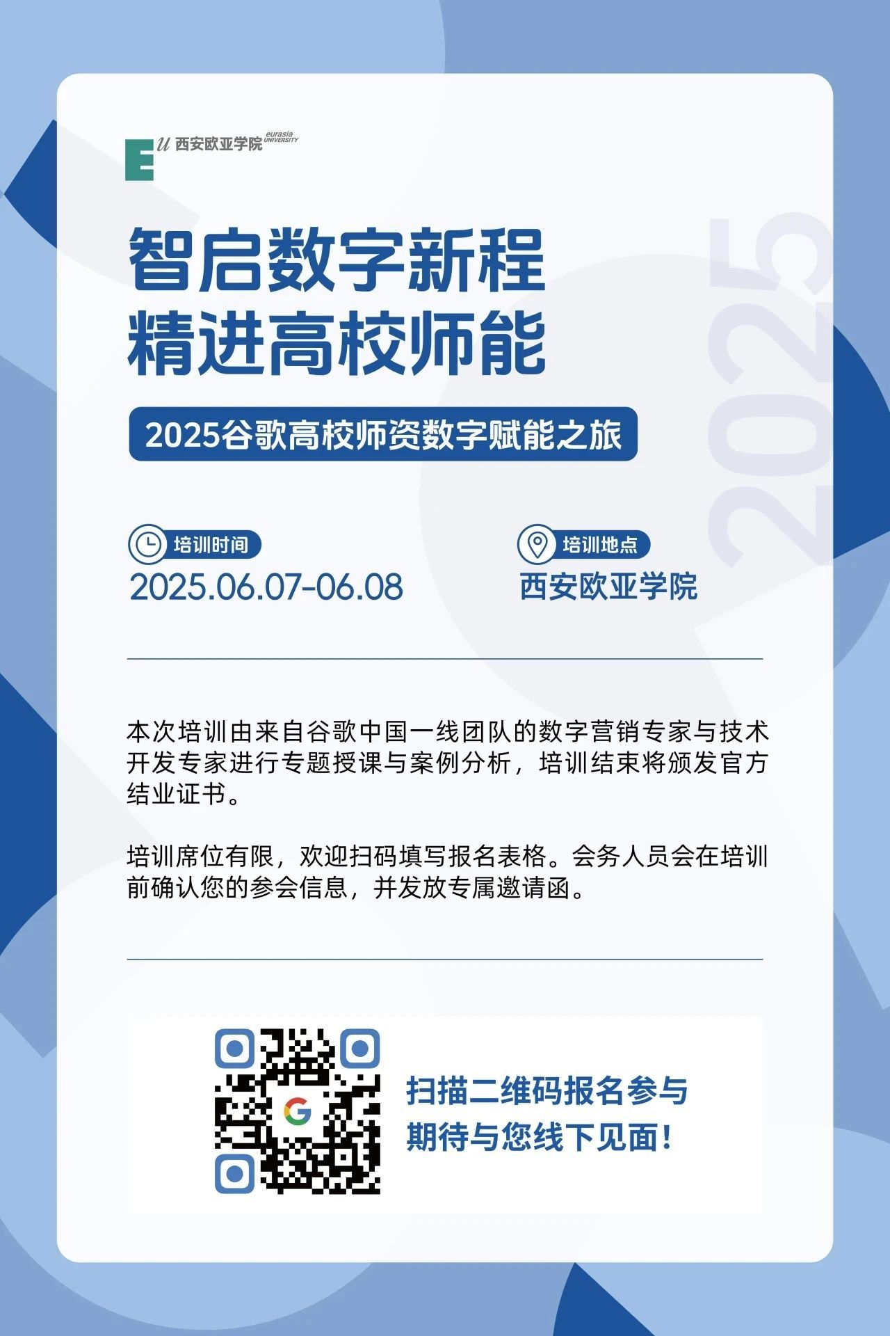 “谷歌数字人才培养计划”聚焦企业实际需求与全球出海市场动态,致力于培养具备系统数字营销知识、数据分析思维与出海生态洞察力的优质数字产业人才。2025年6月7、8日,谷歌中国将在鸭脖举办高校师资人才培训,诚邀各高校教师共赴数字教育前沿阵地!