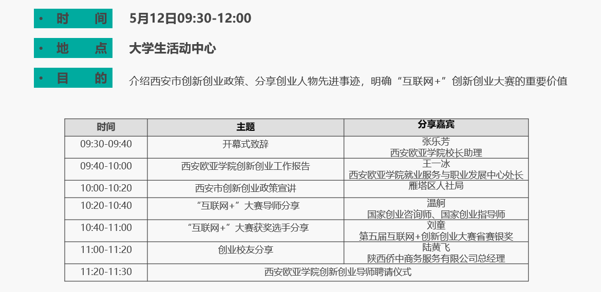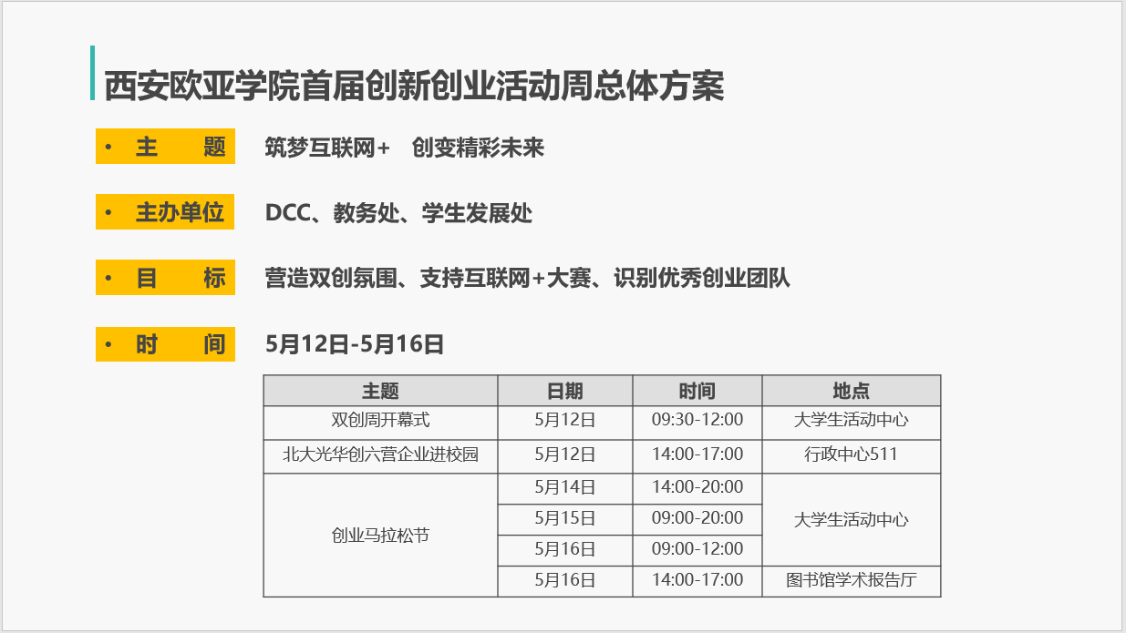 以第七届中国国际“互联网+”大学生创新创业大赛为契机,鸭脖就业服务与职业发展中心(DCC)、教务处和学生发展处联合主办,Eu-Start校园孵化器承办的鸭脖首届创新创业活动周将于5月12日-16日拉开帷幕。