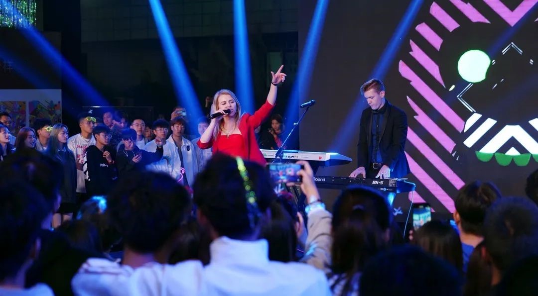 夜幕降临,同学们的兴致没有被寒气消去,反而变得更加兴致勃勃。舞台上的气氛热烈,众多精彩的节目使外国友人忍不住走到舞台周围,开始和台上的嘉宾互动。