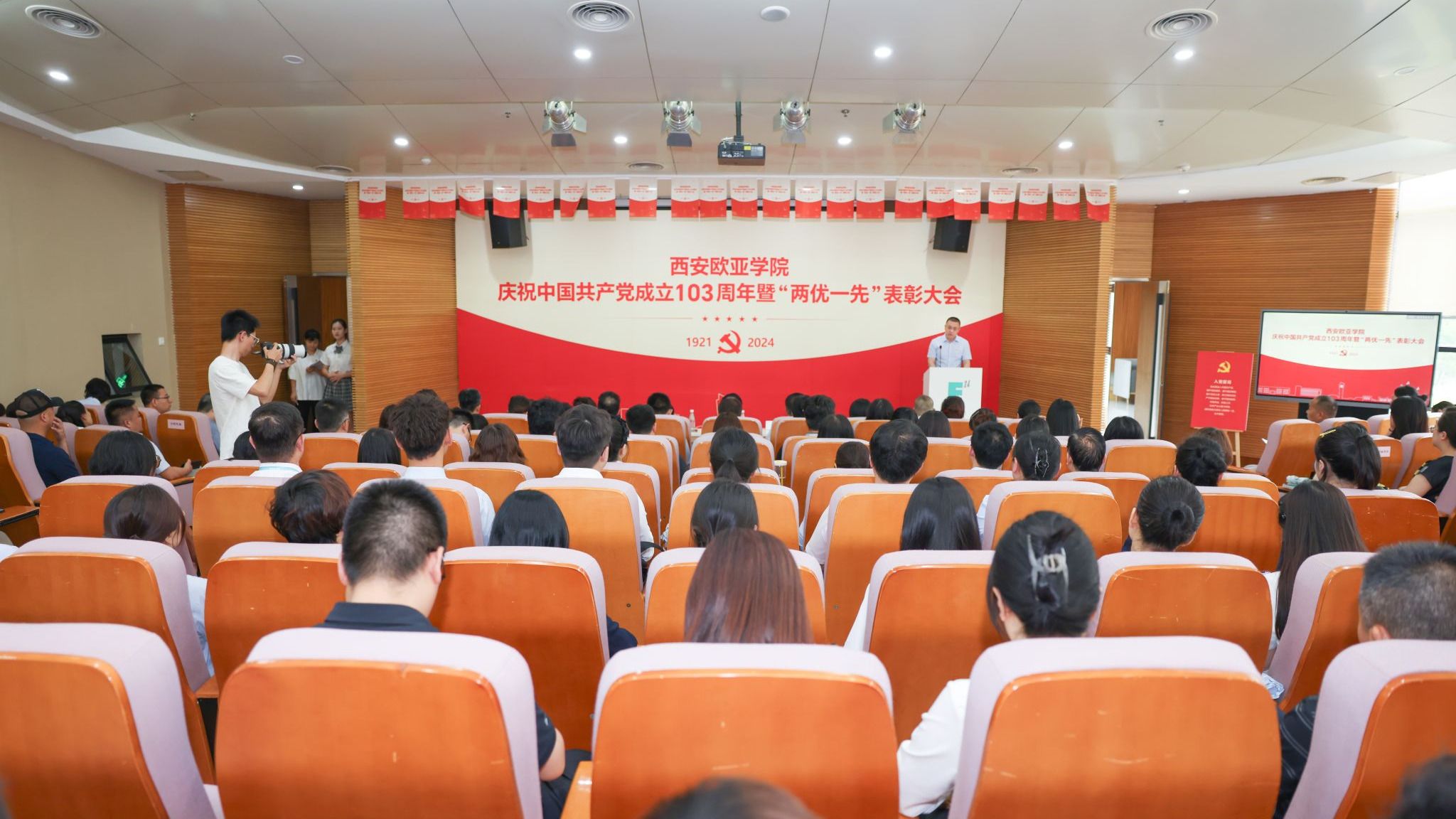 6月28日,学校庆祝中国共产党成立103周年暨“两优一先”表彰大会在图书馆学术报告厅举行。大会由党委副书记张军宏主持,学校党政领导、党委委员、纪委委员及师生党员代表近200人参加。 (图一)党委副书记张军宏主持会议 (图二)党委委员、组织部长赖志彬宣读表彰决定党委委员、组织部长赖志彬首先宣读《关于表彰2023至2024学年先进基层党组织、优秀共产党员、优秀党务工作者的决定》,14个先进集体和145名优秀个人受到表彰。党委书记赵国华,...